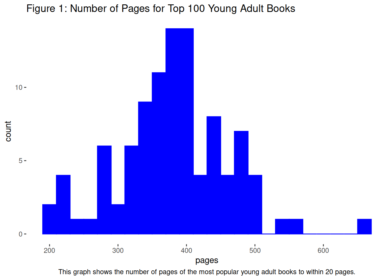 caption = "This graph shows the number of pages of the most popular young adult books to within 20 pages.")