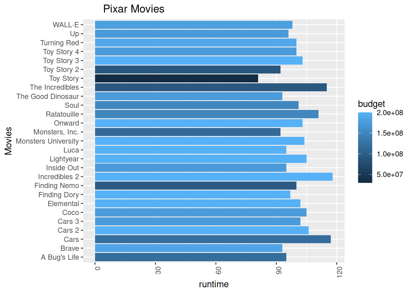 ggplot(MOVIES_3, aes(x = reorder(title, +budget), y = runtime, fill = budget)) +